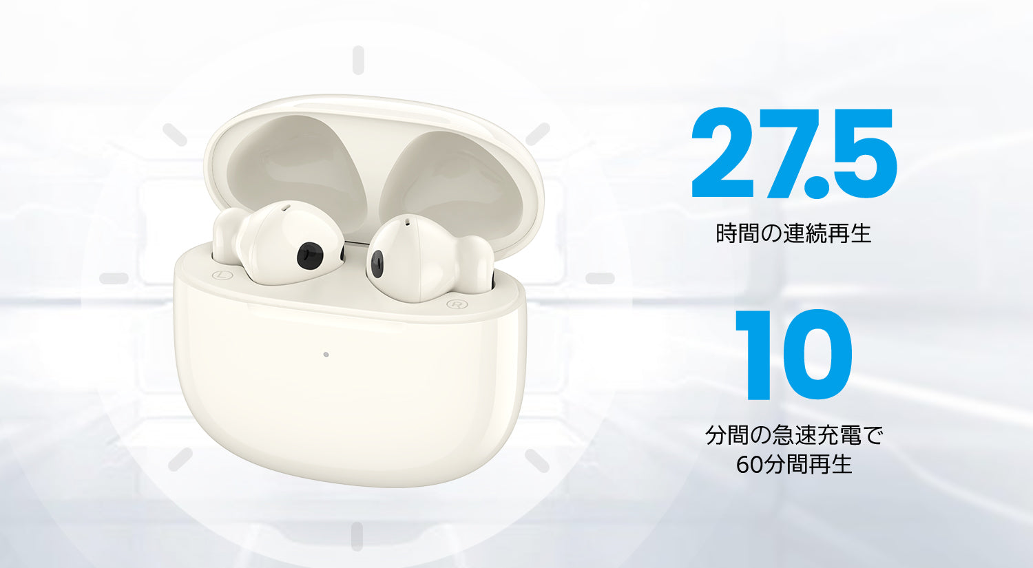 イヤホン本体1回充電すると、最大5.5時間連続再生ができます。それに、急速充電に対応し、わずか10分間の充電で最大60分間再生が可能です。充電ケースと合わせれば、最大27.5時間再生できます。