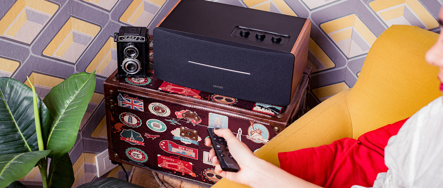 ● 上部に取り付けられた3つのノブで高音、低音、音量/入力を簡単に調節可能。ワイヤレスリモコンを使って離れてもスピーカーを簡単に操作