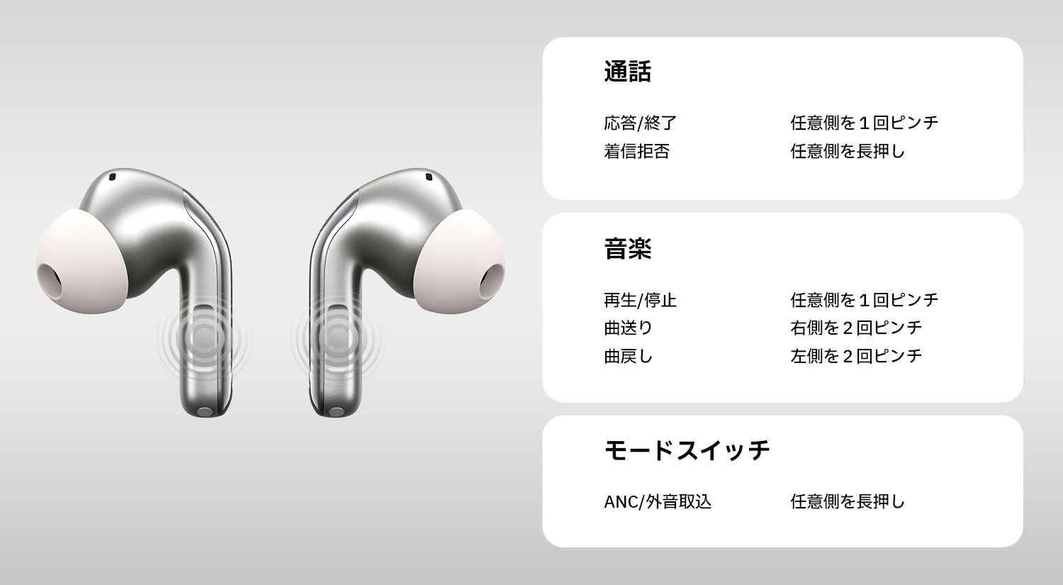 誤操作を防ぐプレス式センサー:押すタイプのセンサーで誤タッチを防ぎます。再生・停止・通話などを簡単に操作できます。