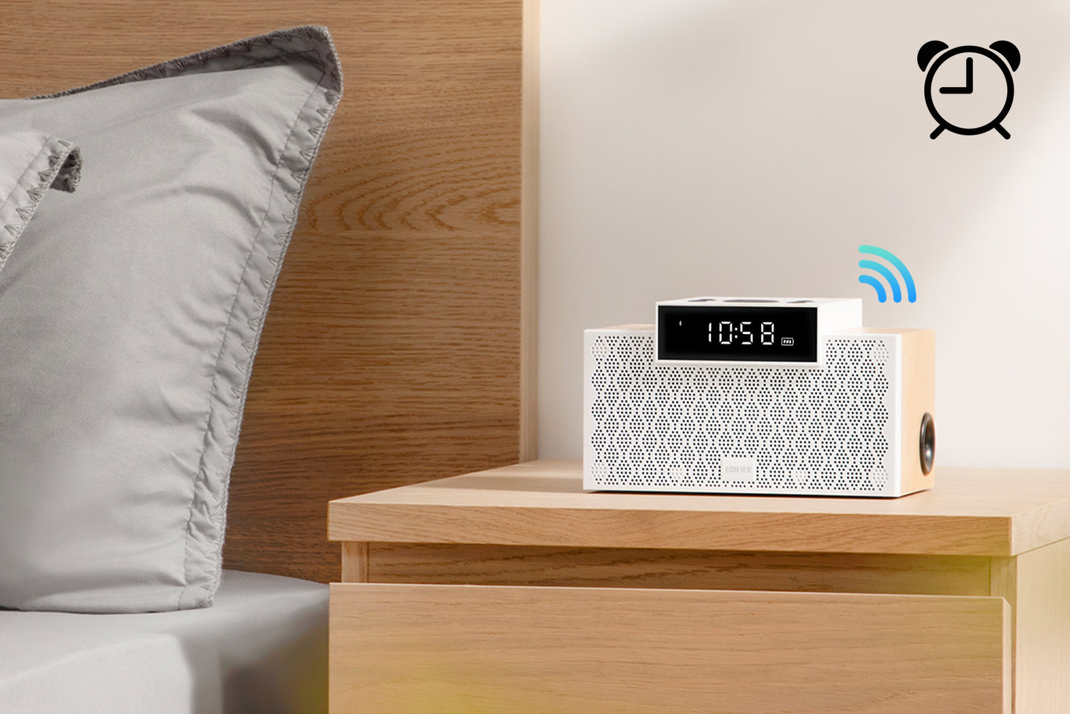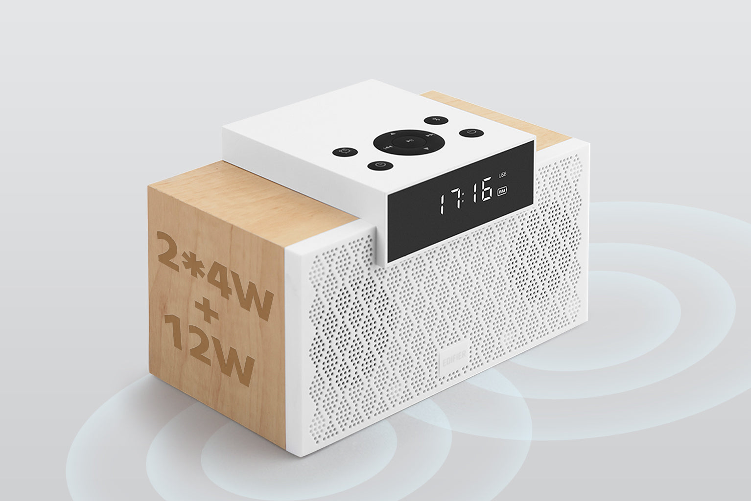 ● コンパクトなボディから出力される2×4Wの中高音と12Wのハイパワーで迫力ある低音により小型スピーカーとは思えないサウンドを実現。家の隅々にまで響くメロディー