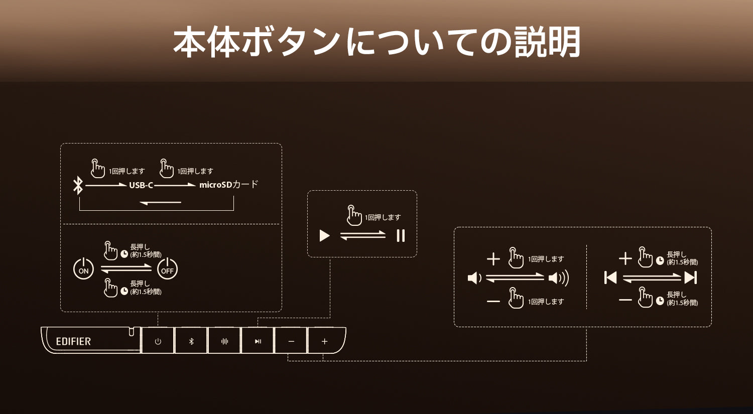 本体のボタンで音楽を簡単にコントロールできます。MP330は5つのプリセットサウンドエフェクトがあり、ボタンで3つのプリセットサウンドエフェクトから切り替え、アプリで環境やアクティビティに合わせてサウンドエフェクトもカスタマイズできます。