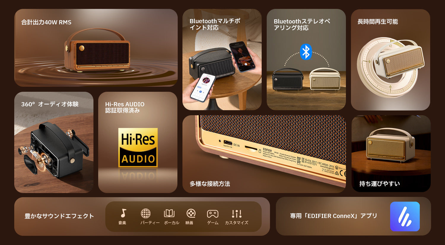 ハイレゾ対応の大迫力サウンド:24bit/96kHz対応の高性能アンプと楕円形ドライバーが、明瞭で立体的な音場を届けます。