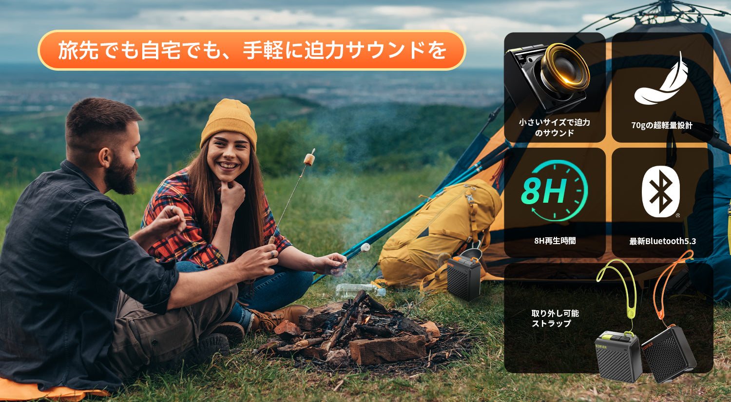 大音量・高音質:40mmドライバーユニットを搭載し、2.2W(RMS)の出力で、旅行やアウトドア活動に最適なパワフルな音質をお届けします。