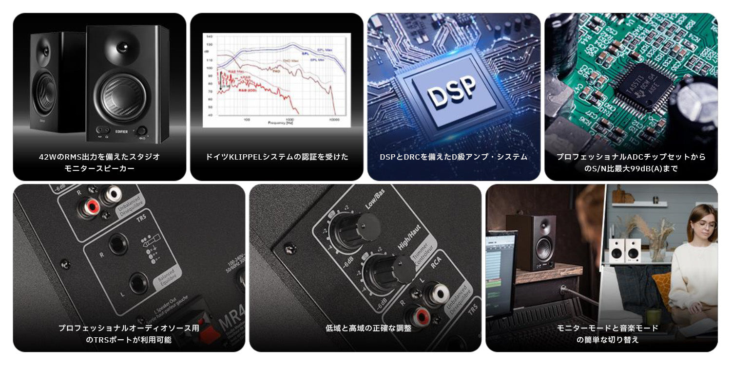 ドイツKLIPPEL認定プログラムの認証取得済みでプロフェッショナルなモニターサウンドを実現しています。Edifier Acoustic LabがドイツのKLIPPEL認定プログラムにより厳密に分析されたユニット特性に基づいて、数十回にわたるプロフェッショナル・チューニングを施しました。これにより、モニターに求められるフラットな音曲線を実現し、真の音楽の魅力を引き出します。音のディテールや正確性を最大限に引き出し、臨場感あふれるサウンドを提供します。