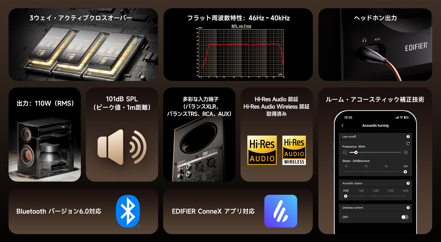 独自の音響アーキテクチャーと3ウェイ・アクティブクロスオーバーを採用し、低域から高域までシームレスな音響特性を実現。音楽制作や映像編集に求められる精密な音像再現性と、日常リスニングにおける自然なサウンドを両立させました。