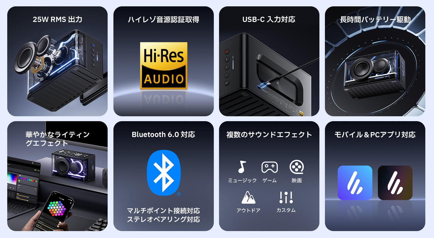 EDIFIER ConneX(モバイル)や TempoHub(PC)アプリで、さらに便利に。音源切替・再生操作・音や光のカスタマイズ・設定もこれ一つで簡単!