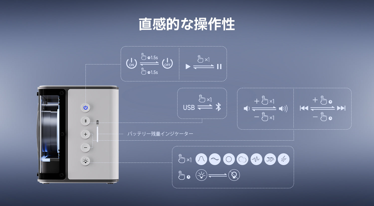 最長15時間の連続再生:50%の音量・ライトオフ設定で、最大15時間の連続再生が可能。持ち運びにも最適です。