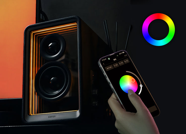 サイドパネルのボタン操作で11種類のプリセット光モードから即座に選択可能。さらに専用アプリ「Edifier ConneX」では1600万色以上のカスタムカラー設定が可能で、お好みの光の色・輝度・動きを細かく調整できます。