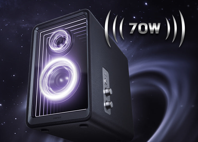 合計70W(RMS)の高出力を実現した2.0スピーカーシステムです。最新のクラスDアンプ(Tlチップ)を採用することで、高効率かつ低発熱でクリアなサウンドを再生。大音量でも歪みにくく、繊細な高音から迫力のある低音まで、バランスの取れた音響体験を提供します。
