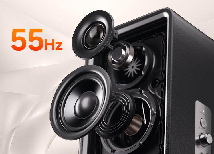 Edifier QR65は高密度MDFキャビネットと独自のMazeTubeバスリフレックスシステムを採用。TurbMuff技術によりポートノイズや共振を大幅に低減し、歪みのないクリアな低音再生を実現しています。