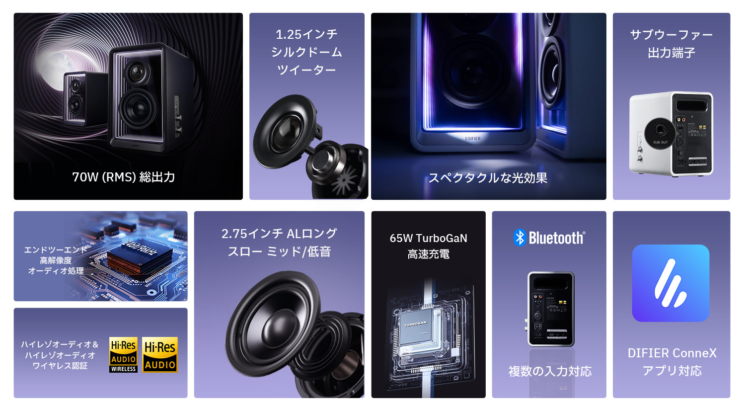 合計70W(RMS)の高出力を実現した2.0スピーカーシステムです。最新のクラスDアンプ(Tlチップ)を採用することで、高効率かつ低発熱でクリアなサウンドを再生。大音量でも歪みにくく、繊細な高音から迫力のある低音まで、バランスの取れた音響体験を提供します。
