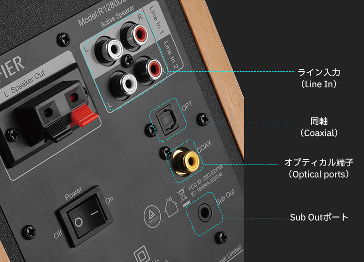 R1280DBSは多彩な入力ポートを搭載し、ライン入力(Line In)、同軸(Coaxial)、オプティカル端子(Optical ports)が使用可能。これにより、様々な機器とのシームレスな接続が可能です。更に、サブウーファーをSub Outポートに接続することで、より迫力のある低音を楽しむことができます。音楽愛好者にとって理想的な環境を提供し、臨場感あふれるサウンド体験をお届けします。
