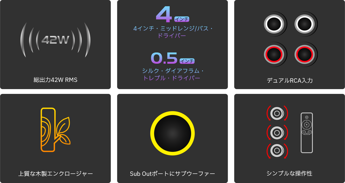 R1280Tsは4つのドライバーユニットを搭載し、合計42W(RMS)の高出力に対応します。これにより、部屋中に広がる迫力あるサウンドで、臨場感あふれる音楽体験が可能です。低音から高音まで幅広い周波数を網羅し、音楽、映画、ゲームなど様々なメディアコンテンツにおいて、最高のエンターテインメントを提供します。