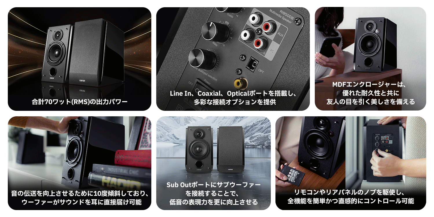R1850DBは、4つのパワフルなドライバーユニットを搭載し、合計70W(RMS)の出力パワーを誇ります。この優れたスピーカーシステムは、部屋中に広がる迫力あるサウンドで、まるでライブ会場にいるかのような臨場感を演出します。映画や音楽、ゲームなど、あらゆるエンターテインメントがより一層楽しいものになることでしょう。