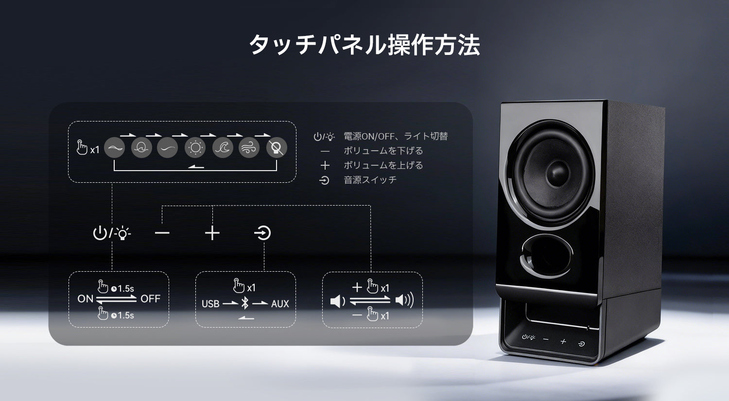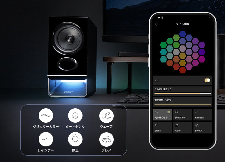 6種類のプリセットライティングエフェクトから選択できるほか、スマホやPC専用アプリを利用して、自分好みにカスタマイズ可能。スピーカー本体のタッチパネルで、ライティングエフェクトの切り替えやオン/オフにすることも可能です。