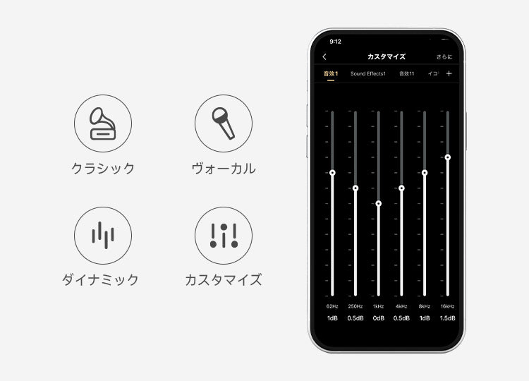 3種類のEQプリセットから選択できるほか、アプリを通じて使用シーンに合わせて自分好みにカスタマイズ可能。