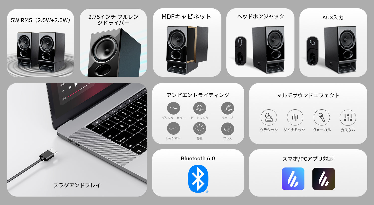1. 総合出力5W RMS、2.75インチフルレンジドライバーとフロントバスレフポートでクリアなサウンド