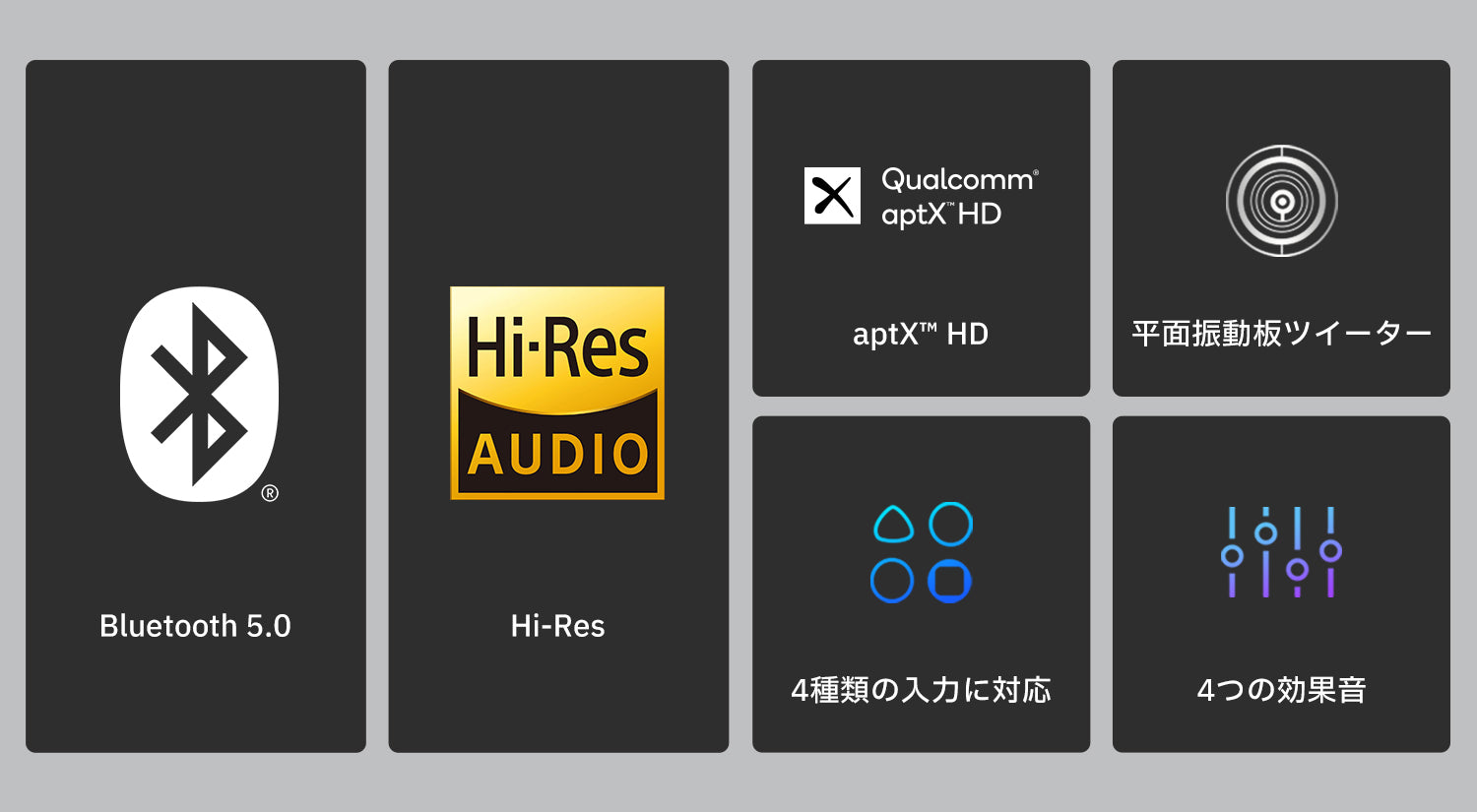 高音質ワイヤレス伝送を実現するaptX HDデコーディング技術を搭載。低遅延で安定した接続が可能なため、CD品質に迫るハイレゾリューションオーディオをワイヤレスでお楽しみください。 -