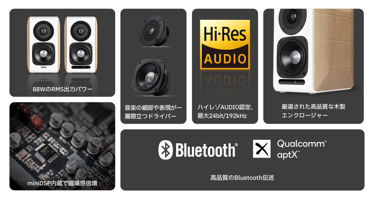 内蔵されたminiDSPによって制御されるハイレゾ対応高性能オーディオプロセッサを搭載しています。このプロセッサは、192kHzまでのサンプリングレートのステレオ信号をサポートし、ハイレゾ音楽の極上のクオリティをお届けします。miniDSPはダイナミックレンジの管理とアクティブクロスオーバーコントロールを正確に行い、音楽の各要素を最適なバランスで再生します。光入力または同軸入力を使用することで、ロスレス品質の音楽を楽しむことができ、まるでアーティストが目の前にいるかのような臨場感を倍増させます。