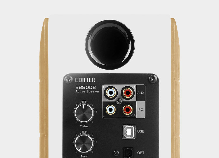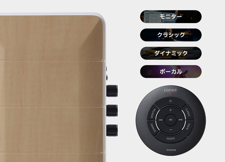 背面のノブと付属のリモコンを使用して、充実した機能を簡単にコントロールできます。特に、4つのプリセットEQが搭載されており、これにより異なる音楽ジャンルに合わせて瞬時に調整できます。お好みの音色に合わせて、モニター、ダイナミック、クラシック、ボーカルなど、さまざまなプリセットから選ぶことができ、その場で臨場感豊かなサウンドをお楽しみいただけます。