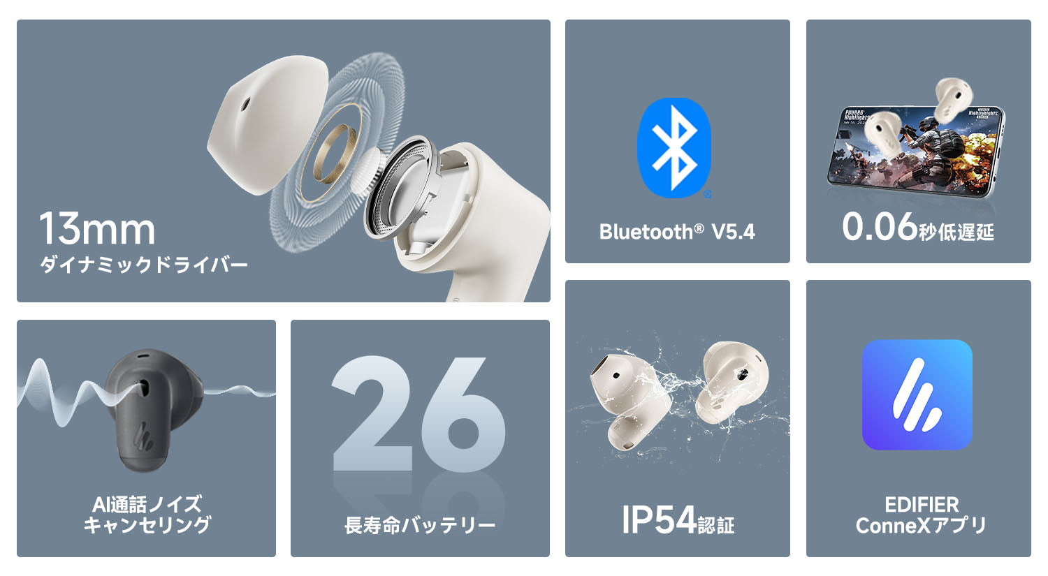 13mmダイナミックドライバーと音響チューニングにより、広がりのある音場とバランスの取れたサウンドを実現します。