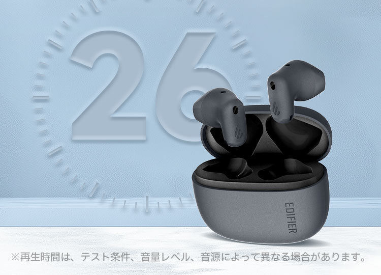 26時間の長寿命バッテリー:最大7時間の再生、充電ケース併用で合計26時間の使用が可能。1日中楽しめるロングバッテリーライフで安心。
