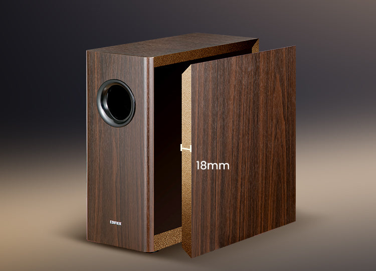 18mm厚MDF(中密度繊維板)筐体を採用し、共振と歪みを低減。キメの細かい、クリアで輪郭のはっきりした低音再生を実現します。