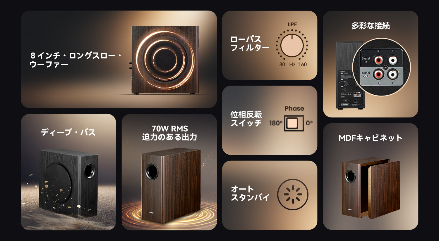 パワフルな70W出力と8インチウーファー搭載:70W(RMS)の高出力と8インチロングスローウーファーを搭載し、迫力ある重低音を実現。深さ35Hzまでの低音域をしっかり再現します。