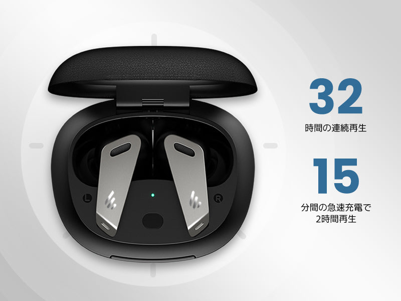 Edifier TWS NB2 Proは、わずか15分の急速充電で、2時間の再生が可能です。(曲の場合は400曲、動画の場合は15本再生できます)。また最大32時間の連続再生です。