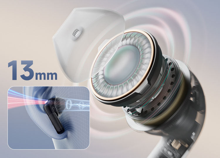 迫力サウンド:13mmダイナミックドライバーと特別音響設計で、広がりある音場と力強い低音を実現。