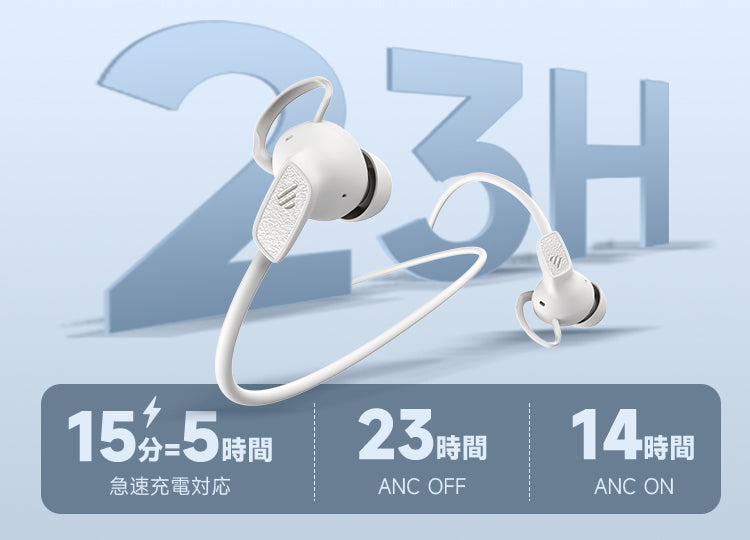 長時間バッテリー & IP55防水:最大23時間の連続再生が可能(急速充電15分で5時間使用可)。IP55防塵防滴仕様ですので、アウトドアや運動時の汗も気になりません。