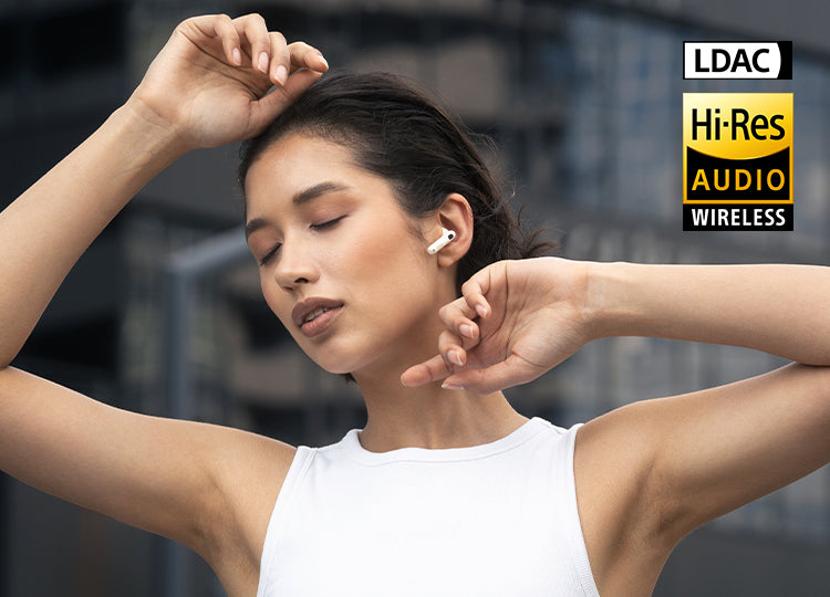 「Hi-Ress Wireless」認証取得の高解像度サウンドで、従来のBluetoothコーデックと比べ最大約3倍の情報量を伝送可能な高音質コーデック「LDAC」に対応します。最大990kbpsの伝送レートを確保することで、96kHz/24bitまでの音質伝送を実現しました。音の歪みを大幅に低減し、飛躍的な音質向上を実現し、圧倒的高音質のリスニング体験を提供します。