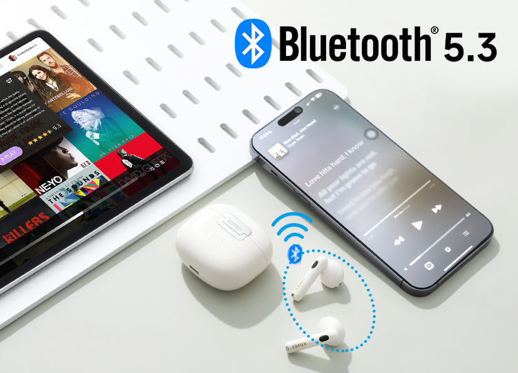 Bluetooth5.3を搭載し、従来のバージョンに比べて接続が大幅に改善。接続時にはより速く伝送、より低電力消費、より高速化を実現しました。