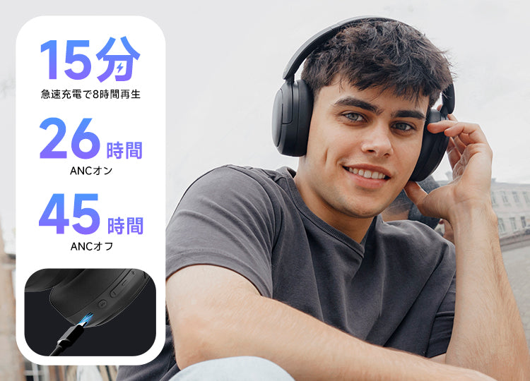 - 【急速充電対応】大容量バッテリーと低消費電力チップセットを内蔵し、ANCオフで最大45時間の連続音楽再生が可能です。
