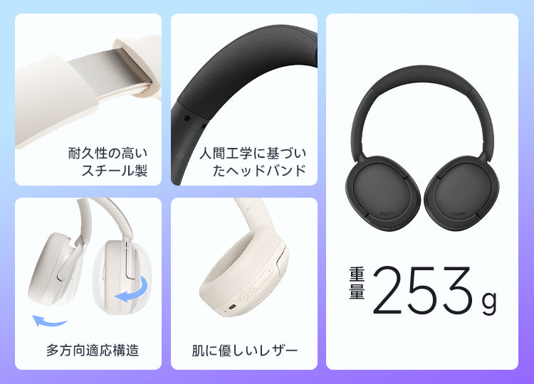 新設計の多方向適応構造は、あらゆる顔の形や耳の輪郭に完璧にフィットし、軽量で圧迫感の少ないヘッドバンドとソフトなイヤークッションを組み合わせることで、驚くほど快適適な装着感を実現します。