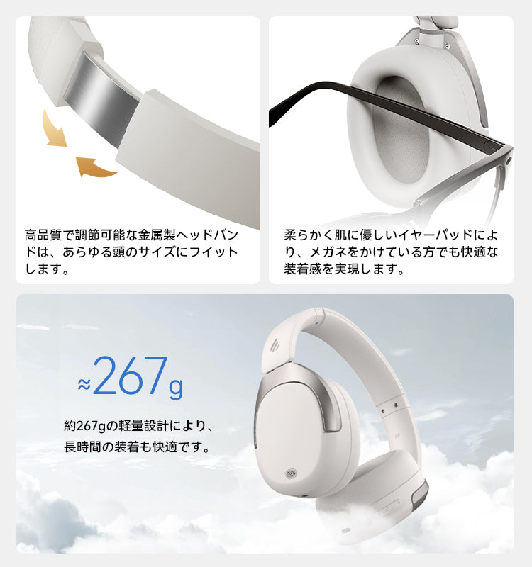 - 新たにアップされたW830NBヘッドホンは、わずか267gの重量で、ゼロ圧感特許技術による低反発クッション素材を採用し、メガネをかけても非常に快適な装着感を与えます。