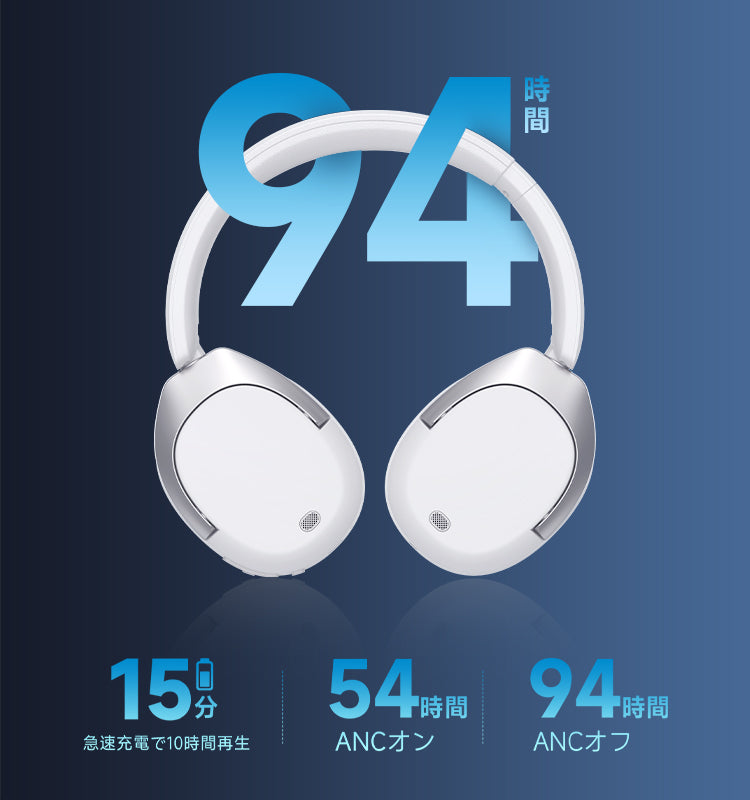 大容量バッテリと低消費電カチップセットを内蔵し、ANC機能オフで最大94時間の連続音楽再生が可能です。いつでもどこでもお気に入りのプレイリストを再生時間を気にすることなく自由に聼くことができます。
