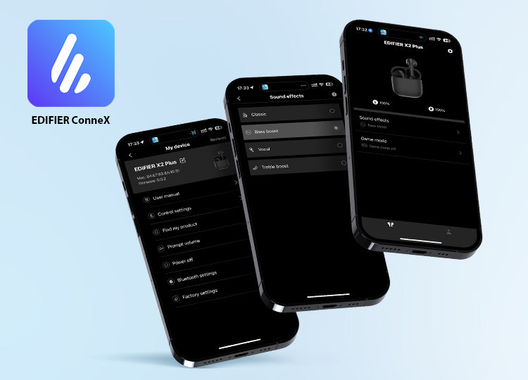 音楽の設定や音質調整、イヤホンの名称変更、紛失時の位置確認など、EDIFIER ConneXアプリ一つで簡単に行えます。