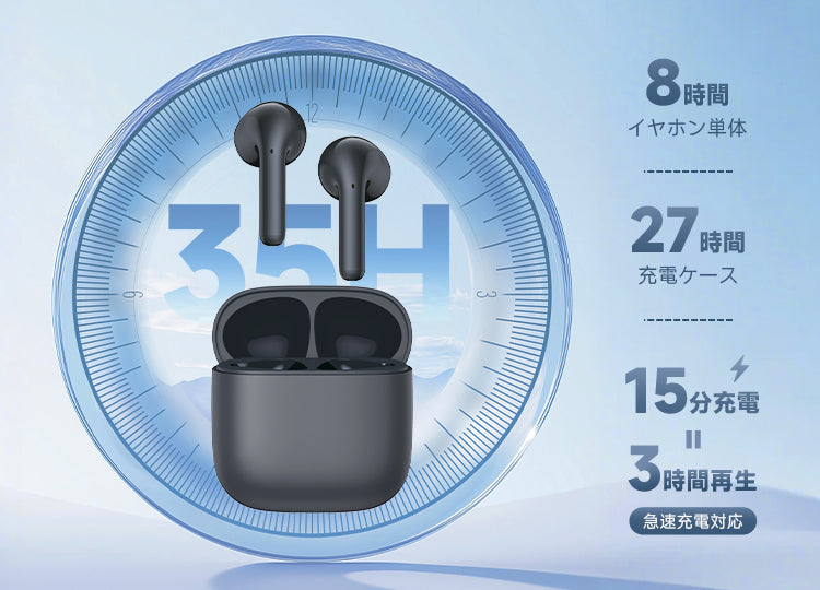 本体のみで最大8時間、充電ケース併用で最大35時間の再生が可能です。途切れることなく音楽をお楽しみいただけます。